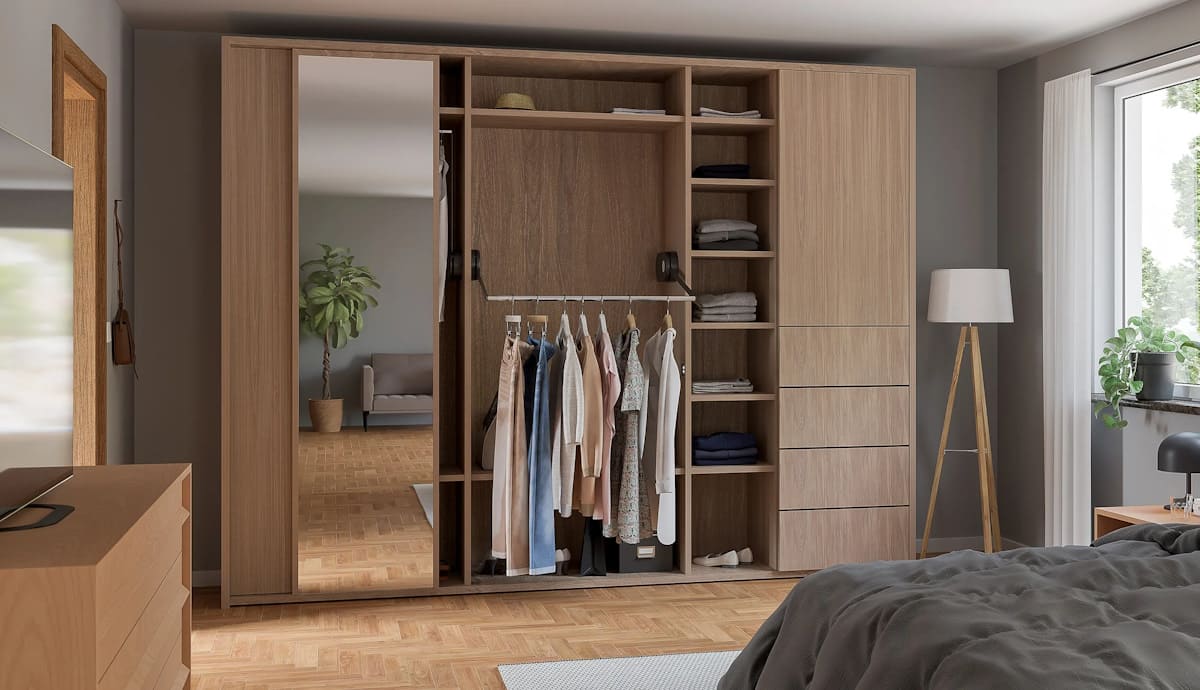 Our electric wardrobe systems have strong chrome telescopic rails for 600-1600mm cabinet widths which can be operated by a choice of Bluetooth mini button, or a stylish black hand held remote control for 1 to 5 units.